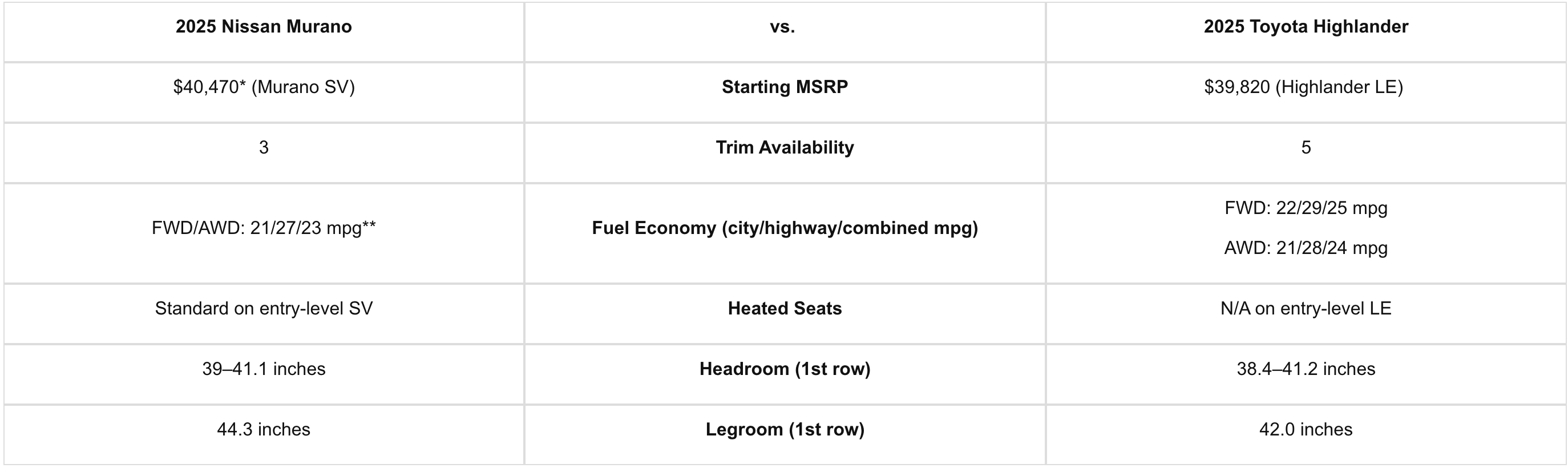 The 2025 Nissan Murano also comes with standard heated seats starting with the entry-level SV trim, whereas the Highlander does not. In fact, if you want heated seats on the 2025 Highlander, you’ll have to skip the entry-level LE and head straight to the XLE, which has a starting MSRP of $42,970. Despite being only one level up from the baseline Highlander LE, the XLE is already significantly more expensive than the Nissan Murano SV, which starts at $40,470* MSRP.