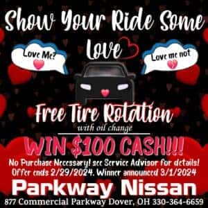 The $100 Giveaway consists of each individual entering to win by filling out an entry form at Parkway Nissan Service Department, 877 Commercial Parkway, Dover, Ohio 44622 only. One entry per individual. Individuals are available to enter on February 1st, 2024 at start of business time 8:00AM and must be completed by the close of business on February 29th, 2024 at 6:00pm.